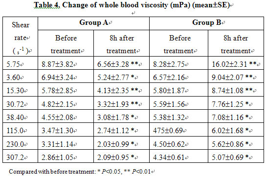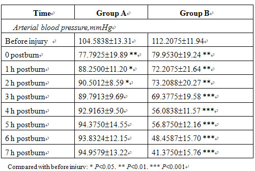Before injury and at 5 min after injury, RR, HR and ABP were not significantly different between the two groups. In group B, RR and HR increased, ABP decreased progressively postinjury and the blood viscosity was raised markedly after treatment compared with that of before treatment. In group A, the MEBO-treated group, the RR, HR and ABP of all animals gradually recovered to the preinjury levels after treatment while blood viscosity decreased significantly (Tables 3, 4).
