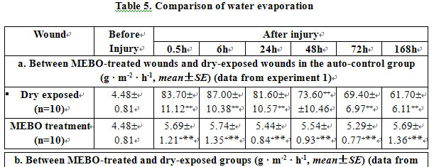 This research revealed that burns wounds treated with MEBO had less water evaporation than those treated with conventional dry-exposed therapy. The rate of evaporation was approximate to that of normal skin. Unlike Vaseline, MEBO had excellent permeability allowing active drainage of excreta.  MEBO demonstrated that its moist physiological environment is favorable to wound healing.