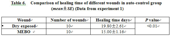 After injury, the wounds in all three experimental groups appeared pale or red-white, with inflammation and swelling above the level of wound edge. Wounds treated with dry-exposed therapy gradually dried and sunk below the level of the wound edge. Wounds treated with MEBO remained moist and swellings subsided within 48 h postburn. Necrotic tissues began to liquefy from superficial to interior and were removed. In experiment 1, MEBO-treated wounds healed more quickly than the dry-exposed auto-control wounds. The difference was statistically very significant (P<0.01, Table 6). Wounds treated with Vaseline became macerated after 6 h and were getting worse with serious and persistent tissue edema. The eschar dissolved earlier than wounds treated with MEBO.