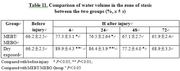 The study involved 34 adult patients suffered 30~40% TBSA burns with more than 20% TBSA of deep second-degree wounds, all of whom were admitted to the hospital at 4~5 h after injury. All subjects were randomized to receive either BRT with MEBT/MEBO or conventional dry-expose therapy. The MEBO group included 18 patients (11 male, 7 female) with a mean age of 26±10.9 years while the dry-exposed group comprised 16 patients (10 male, 6 female) with a mean age of 28±12.0 years.