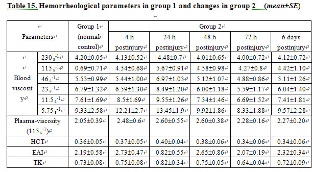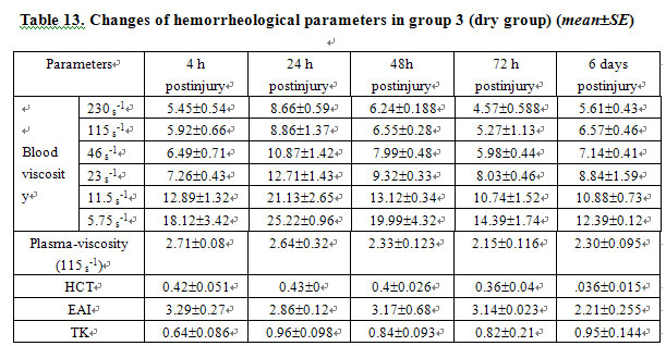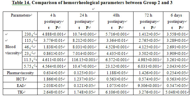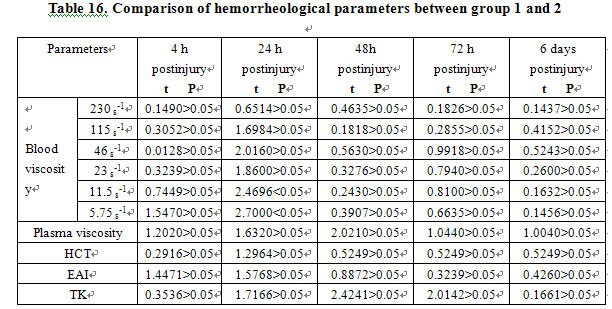 Owing to the minor difference of sex and strain in the hematological parameters of the rabbits, it was feasible to work out a uniform range [1-4]. Randomized division kept animals in a normal control group, allowing the MEBO-treated and the dry-exposed groups to live under the same conditions. Therefore, no repeated blood sampling was allowed and the data were significantly valuable. Apparent blood viscosity and plasma viscosity at different shear rates in group 3 were higher than those in group 2. Table 13 shows that the parameters in group 3 began to increase at 4 h post-injury, peaked at 24 h, and remained higher at 48 h, 72 h and 6 days than those in group 2. There were significant statistical differences (Table 14, P<0.01). Compared to the normal group, parameters including apparent blood viscosity, plasma viscosity and others in the MEBO-treated group began to increase at 4 h postinjury, peaked at 24 h, decreased at 48 h, further decreased at 72 h and nearly returned to normal at 6 days (Table 15). But statistical analysis showed that hematological parameters did not change significantly (P>0.05), except at 24 h postinjury when the blood viscosity at shear rates of 11.5s-1 (t=2.4696, P<0.05) and 5.75s-1 (t=2.700, P<0.05) increased markedly (Table 16).