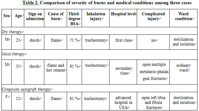 In accordance with the international classifications and standards of burn severity, 3 cases were significantly comparable. Though there are remarkable differences in medical conditions, the results revealed many more differences in therapeutic effects (table 2).