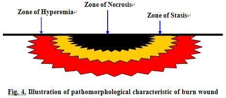 1. Physical Injury Phase: This includes direct and indirect physical injury. Immediately following skin surface exposure to thermal source, the resultant direct injury leads to necrosis of interface skin, which is called “direct physical thermal injury”. Although the thermal source causing the direct injury is removed, the heat does not dissipate from the skin immediately. The residual heat continues to produce a cumulative thermal effect which causes secondary thermal injury to the skin. This secondary trauma usually persists for 6~12 h. This is called “indirect physical injury phase”.