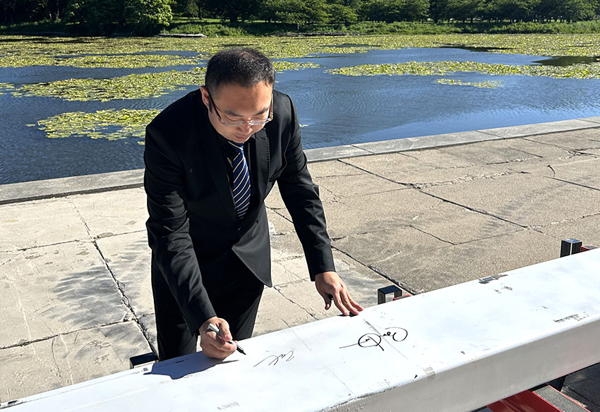 當?shù)貢r間2024年6月10日,美寶集團董事局主席徐鵬受邀在備受矚目的奧巴馬總統(tǒng)中心施工現(xiàn)場的頂樓橫梁上簽下了自己的名字,這條橫梁將被置放于奧巴馬總統(tǒng)中心的最高點——博物館大樓的“天空屋”內(nèi)。這是繼奧巴馬總統(tǒng)本人之后,第二位在這座即將崛起的綜合性建筑上留下永恒印記的貢獻者。