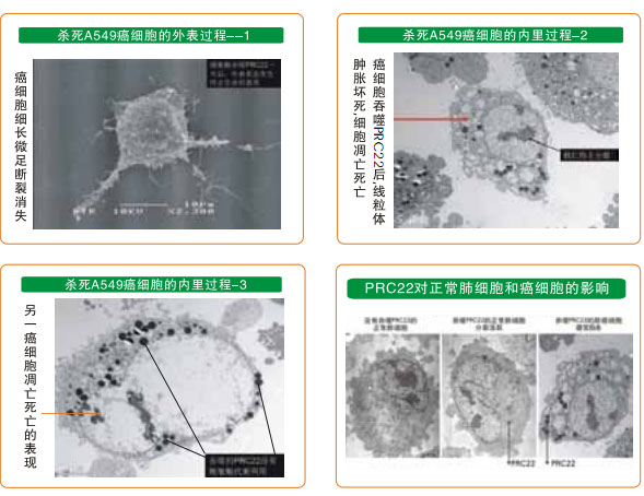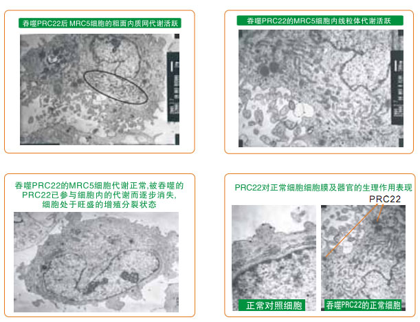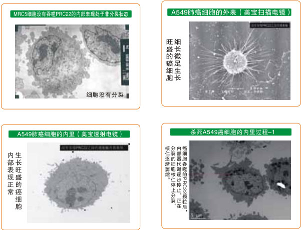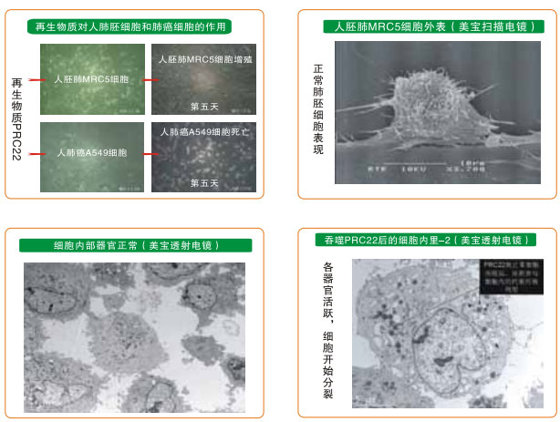 在獲得再生物質對癌細胞生命作用研究結果的基礎上,我們選人胚肺MRC5細胞作為正常細胞,人肺癌A549細胞作為癌細胞,用人肺組織的再生營養(yǎng)物質作為試驗物質,對正常細胞和癌細胞進行體外培養(yǎng),觀察再生物質進入細胞內是如何產生作用的。其結果為,正常細胞吞入再生物質后,細胞內的各個器官代謝旺盛,細胞核分裂表現(xiàn)活躍,再生物質在細胞內被代謝消耗;沒有加入再生物質培養(yǎng)的正常肺細胞對照組的細胞,沒有產生明顯的增殖變化。而肺癌細胞吞入再生物質后,細胞內各器官代謝立即停止,第一天,細胞自斷偽足,細胞內的線粒體腫脹死亡,細胞核仁萎縮,吞入的再生物質沒有發(fā)生代謝消耗性反應,第二天后細胞凋亡性死亡,吞入的再生物質完好無損。如此的試驗結果認為,再生物質對正常細胞內各器官的作用是一種再生營養(yǎng)素,而對于癌細胞內的器官則是致死性物質。試驗結果還表明,再生物質的作用首先發(fā)生在細胞質內的器官中,而后影響細胞核內。這樣的結果所見可能是人類攻克癌癥的一個嶄新途徑。(參見下列系列電鏡圖片)