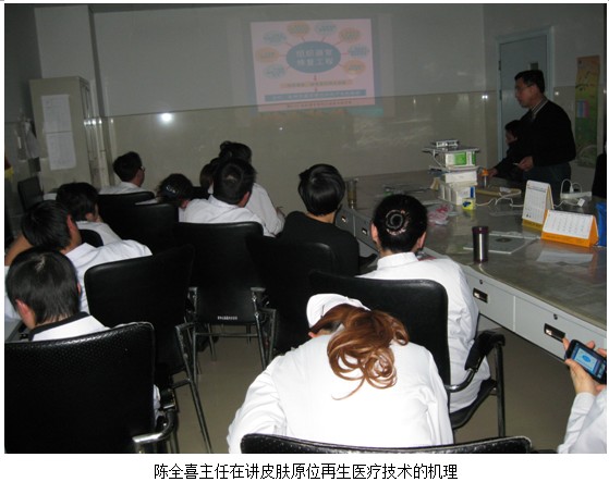 2012年12月10日下午兩點,中國中西醫(yī)結(jié)合學(xué)會燒傷專業(yè)委員、北京美寶燒傷創(chuàng)瘍研究所臨床部副主任醫(yī)師陳全喜應(yīng)邀來到信陽市中醫(yī)院與燒傷科、外科、婦科、內(nèi)分泌科的醫(yī)師進行皮膚原位再生醫(yī)療技術(shù)的培訓(xùn)。
