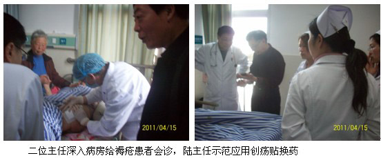 講課結(jié)束后二位主任深入病房和鄉(xiāng)鎮(zhèn)衛(wèi)生院會(huì)診,陸主任親自為褥瘡患者換藥,指導(dǎo)示范創(chuàng)瘍貼的換藥深受患者家屬和醫(yī)護(hù)人員的歡迎。