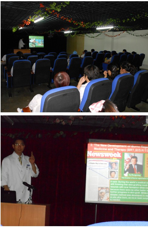 北京片區(qū)在陳永翀主任幫助下聯(lián)絡(luò)醫(yī)院科教科,于在2012年6月14號下午,在該院培訓(xùn)大廳進(jìn)行再生技術(shù)和產(chǎn)品的繼續(xù)教育培訓(xùn),參加科室有外科、骨科、兒科、糖尿病科的三十多名醫(yī)護(hù)人員。陳永翀主任所講內(nèi)容不僅涉及燒傷創(chuàng)面修復(fù),還在糖尿病潰瘍、褥瘡方面結(jié)合病例進(jìn)行講解,醫(yī)生們被再生技術(shù)的神奇療效深深吸引,會(huì)場學(xué)習(xí)氣氛濃厚,培訓(xùn)結(jié)束后糖尿病科的醫(yī)生與陳主任進(jìn)行了更細(xì)致的討論。