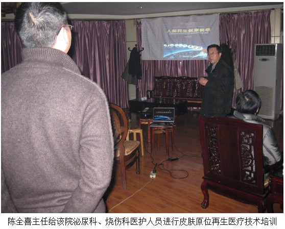 2013年1月16日,中國中西醫(yī)結(jié)合學(xué)會燒傷專業(yè)委員會委員,北京美寶燒傷創(chuàng)瘍研究所臨床部專家陳全喜主任受信陽市中心醫(yī)院泌尿外科主任陸偉的邀請,和區(qū)域經(jīng)理李瑩瑩一同到信陽市中心醫(yī)院泌尿外科進行全科人員的皮膚原位再生醫(yī)療技術(shù)的培訓(xùn)。