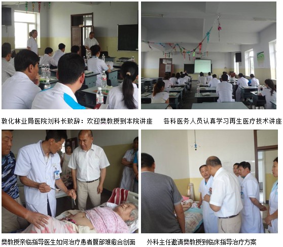 會議結(jié)束后,應(yīng)普外科張主任邀請,樊兆宗教授來到病房會診了兩例患者:一例褥瘡病人,另一例為腹部難愈合創(chuàng)面,產(chǎn)生竇道,樊教授結(jié)合病人情況再次講解了如何運用再生醫(yī)療技術(shù)來進行規(guī)范治療。本次學(xué)術(shù)活動對再生醫(yī)療技術(shù)在敦化林業(yè)局職工醫(yī)院的推廣工作打下了堅實的基礎(chǔ)。