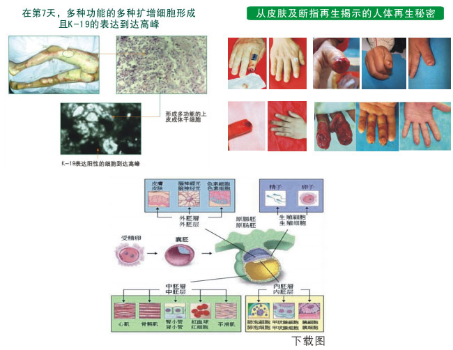 我們從皮膚和斷指再生復(fù)原結(jié)果來揭示人體再生。斷指能再生嗎?世界上認(rèn)為斷指是不可能再生的。新生兒指尖少了一點可以再長,這是因為其還未發(fā)育完全,但成年人就不可能再生了。不久前,美國《科學(xué)》雜志組織了很多科學(xué)家設(shè)想了將來要解決的問題,其中就有斷指再生??墒俏覀円呀?jīng)把它變成了現(xiàn)實,我們也不是先發(fā)現(xiàn)了再生后才有了斷指再生,也不是由燒傷的皮膚再生想到了指頭再生,而是在試驗中才發(fā)現(xiàn)了這個斷指再生的現(xiàn)象。我在以往的實驗中發(fā)現(xiàn)環(huán)境決定了器官的修復(fù)程度,但起初并沒有聯(lián)想到再生,后來才在細(xì)胞試驗中發(fā)現(xiàn)愈合傷口的細(xì)胞有差異,我就開始認(rèn)為這是再生細(xì)胞造成的,經(jīng)過做實驗,最后發(fā)現(xiàn)了斷指也可以再生。我們的這個斷指再生是再生復(fù)原,恢復(fù)得和受傷前一模一樣,而不是他們說的普通愈合。我從這個聯(lián)想到人的肢體,這個手指頭和人的腿,胳膊是一樣的,都有血管、神經(jīng)、骨頭、肌肉、皮下組織等各個組織與器官。不要看這些部位它們大小相差很大,但組成指頭和腿的四大組織神經(jīng)組織、肌肉組織、結(jié)締組織、上皮組織是一樣的,而指頭的組成組織比腿還要多。人雖然至少有60萬億個細(xì)胞組成,但可以都劃分到這四大類之中。所以我就從這指頭的再生聯(lián)想到人的其他器官和組織的再生,考慮到它們在胚胎時的關(guān)系,這個意義就大了。大家知道(如圖示各個胚胎發(fā)育結(jié)果)胚胎的三個胚胎層產(chǎn)生的器官不同,按一般的理論,人的器官損壞了要想再生,必須走從胚胎到這些器官的發(fā)育過程,可是我們沒有這么做,就實現(xiàn)了器官再生。這個結(jié)果就把傳統(tǒng)的生命科學(xué)常識顛覆了,無論那些生命科學(xué)家的經(jīng)驗多好,資料多豐富,在我們這里都用不上了,我們沒有任何經(jīng)驗和規(guī)律可借鑒,只要按發(fā)現(xiàn)的規(guī)律向前實踐,這也是我們?yōu)槭裁匆⑷梭w再生復(fù)原科學(xué)的原因。