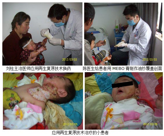 2011年11月14日~17日,杜福勤主任再次來到燒傷整形科,在齊國選主任的帶領下看望了住院的燒傷和整形患者,并給予再生技術規(guī)范換藥。15日給予示范換藥治療后,得到患者及家屬的認可和歡迎,特別是幼兒患者,應用再生技術換藥后患兒立即停止哭鬧。16日,應用MEBO創(chuàng)瘍貼給頸胸部燙傷患兒和上下肢燒傷植過自體皮的患兒換藥治療,收到了良好的臨床效果。