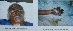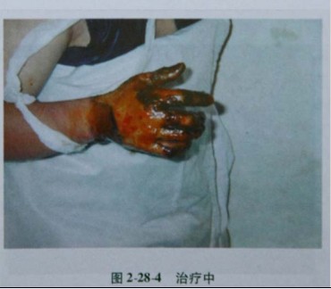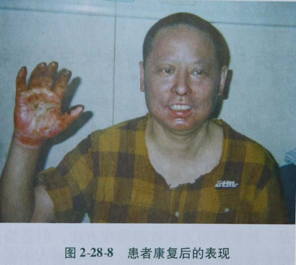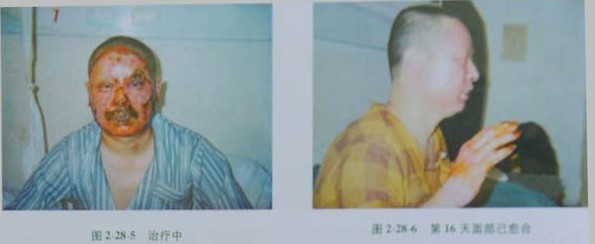 次日,患者頭面部腫脹明顯,散在小水皰,部分表皮脫落,基底紅白相間,痛覺遲鈍,鼻毛燒焦但拔毛有痛覺,右手表皮脫落,中度腫脹,活動障礙,手指焦黑收縮,手背呈蠟白色,痛覺消失。據(jù)此,對患者做出了進(jìn)一步診斷:頭面部、右手燒傷合并輕度吸入性損傷(總面積約6%,淺Ⅱ度約2%、深Ⅱ度3%、淺Ⅲ度1%),并確立診療方案,規(guī)范各項操作技術(shù),患者第2天病情就有了明顯好轉(zhuǎn),雙眼、口唇腫脹明顯減輕,手指能適當(dāng)活動。創(chuàng)面于傷后第10天愈合,右手背、指背的創(chuàng)面在傷后第16天基本愈合,右手功能將完全恢復(fù)(圖2287,圖2288)。