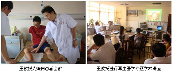 在學(xué)術(shù)講座開始前,王教授應(yīng)邀首先深入該醫(yī)院外一科(包括:燒傷整形科、神經(jīng)外科、泌尿外科)病房為一名排氣管燒傷患者會診,指導(dǎo)規(guī)范的創(chuàng)面處理方法。隨后王教授應(yīng)邀在外一科醫(yī)生辦公室進行了“再生復(fù)原療法在燒傷及難愈性創(chuàng)面臨床規(guī)范化處理”的專題學(xué)術(shù)講座,該醫(yī)院主管副院長兼外一科主任黃永東主任醫(yī)師主持并全程聆聽了學(xué)術(shù)講座,該醫(yī)院醫(yī)務(wù)科長也參加了學(xué)術(shù)講座。