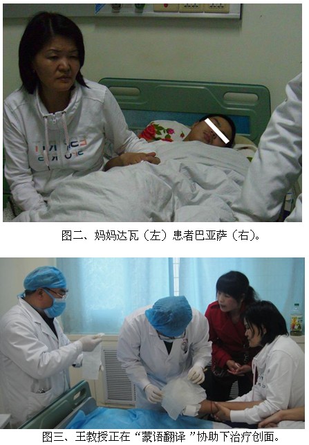 由于親戚臨時(shí)有事沒(méi)來(lái),母子二人為了保住巴亞薩凍傷的腳,從蒙古國(guó)不遠(yuǎn)千里來(lái)看病。大家只知道躺在病床上的小伙子名叫巴亞薩,20歲,右腳部被嚴(yán)重凍傷14天,腳趾頭變黑。初時(shí)只見(jiàn)蒙古國(guó)小伙的右腳纏著厚厚的紗布繃帶,旁邊的紙上寫(xiě)著他的名字(BAYASAA)。當(dāng)王教授問(wèn)他問(wèn)題時(shí),他只能用迷惑和搖頭來(lái)回答。由于語(yǔ)言不通,巴亞薩喊疼時(shí)大家都聽(tīng)不懂。他們出去買(mǎi)點(diǎn)食物都得給親戚打電話問(wèn)清楚才能出去買(mǎi)。在“診療計(jì)劃”也無(wú)法告知患者的難題下,王教授和醫(yī)生求助了電視臺(tái)、報(bào)紙等媒體向社會(huì)征集蒙古語(yǔ)翻譯的志愿者,好解決和患者的交流問(wèn)題。