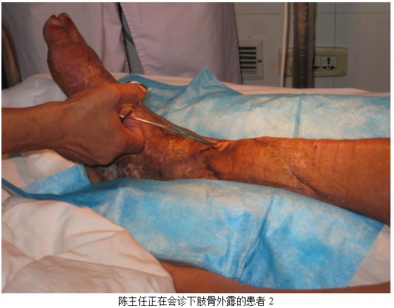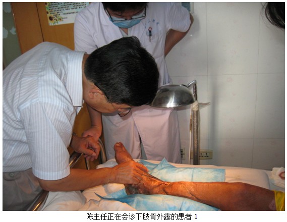 2012年8月5日中國(guó)中西醫(yī)結(jié)合學(xué)會(huì)燒傷專業(yè)委員會(huì)委員、北京美寶燒傷創(chuàng)瘍研究所臨床部專家陳全喜應(yīng)河南省新鄉(xiāng)醫(yī)學(xué)院第三附屬醫(yī)院骨科李主任和孫大夫的邀請(qǐng),會(huì)診一例下肢骨露的患者。