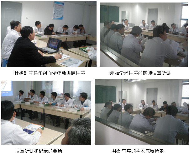 2012年10月24日下午14:30分中國中西醫(yī)結(jié)合學會燒傷專業(yè)委員會委員、北京美寶燒傷創(chuàng)瘍研究所臨床部杜福勤主任和學會駐安徽辦事處吳崇魏同志應(yīng)皖北總醫(yī)院燒傷整形科齊國軒主任的邀請,為該院燒傷整形科、腦外科、骨科、泌尿外科、內(nèi)分泌科舉辦《中西醫(yī)結(jié)合創(chuàng)面治療新進展》學術(shù)講座。參加講座學習的30余人認真聽取了杜福勤主任圖文并茂、通俗易懂的演講,會后解答了臨床遇到的實際問題,講座進行了二個多小時,受到與會者的歡迎和好評。