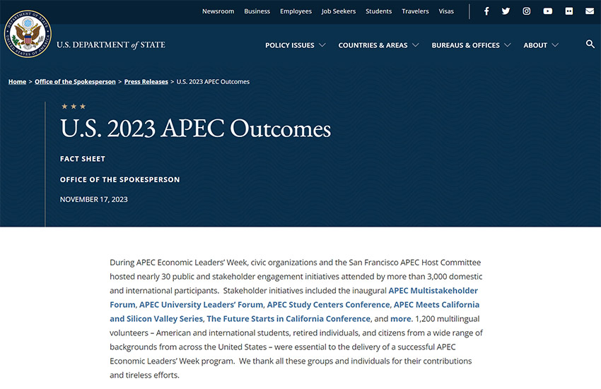 美國國務(wù)院發(fā)布2023 APEC成果報(bào)告,灣區(qū)委員會(huì)相關(guān)活動(dòng)列為重要成果