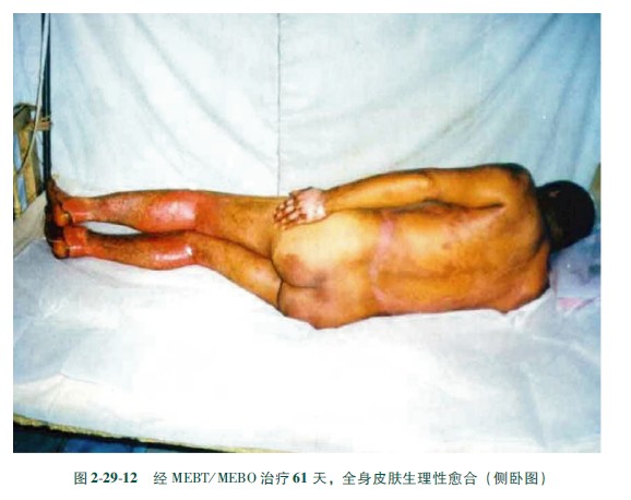 1)中小面積燙傷局部治療的重點(diǎn)為創(chuàng)面處理,首先用溫水或溫鹽水清洗創(chuàng)面,凡有水皰的淺Ⅱ度創(chuàng)面強(qiáng)調(diào)低位剪破皰皮,小水皰也是如此,將皰液放凈,以減少毒性物質(zhì)的吸收,然后在創(chuàng)面上涂MEBO,每日34次。深Ⅱ度或小面積Ⅲ度淺型創(chuàng)面的早期處理方法與淺Ⅱ創(chuàng)面基本相同,原則上清除創(chuàng)面上的殘留液體及有毒物質(zhì),根據(jù)情況實(shí)施“耕耘減張”療法,既利于MEBO滲入創(chuàng)面,又可引流毒性物質(zhì)。Ⅲ度深型創(chuàng)面的處理方法視熱液中所含有毒物質(zhì)的毒性而定,對(duì)于那些會(huì)誘發(fā)靶器官損傷的患者,可手術(shù)切除壞死組織與自體皮簇移植治療,以預(yù)防或減輕毒性物質(zhì)對(duì)臟器的損害。