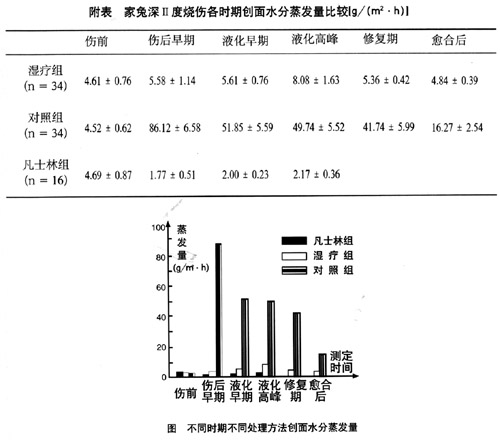 燒傷后,對(duì)照組創(chuàng)面水分蒸發(fā)量大幅度增加,可達(dá)正常皮膚的19倍,傷后6~8h以后呈逐漸下降趨勢(shì),直至創(chuàng)面愈合以后其水分蒸發(fā)量始終未降到傷前正常皮膚的水平。濕療組創(chuàng)面水分蒸發(fā)量在傷后也立即增高,但明顯低于對(duì)照組,在早期約為對(duì)照組的1/16;此后,隨液化反應(yīng)的加強(qiáng),其創(chuàng)面水分蒸發(fā)量也隨之上升,液化高峰時(shí)其蒸發(fā)量也達(dá)高峰,而后逐漸下降;修復(fù)期蒸發(fā)量與受傷早期無(wú)明顯差異(P>0.05);創(chuàng)面愈合后水分蒸發(fā)量基本恢復(fù)至傷前正常皮膚的水平。凡士林組的創(chuàng)面水分蒸發(fā)量則始終維持在一個(gè)比較恒定的低水平上;進(jìn)入修復(fù)期后,由于大部分創(chuàng)面發(fā)生感染,蒸發(fā)量未進(jìn)一步監(jiān)測(cè)。見(jiàn)附表。