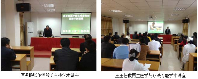 醫(yī)務股張傳燁股長提前等候在大門口迎接王主任的到來,會議室坐滿了醫(yī)院各相關科室的30多名醫(yī)務人員,在學術講座開始前,王主任首先向與會專家和醫(yī)護人員通報了我國著名生命科學家、醫(yī)學家徐榮祥教授在美國起訴諾獎委的相關信息,然后以圖文并茂和詳實的圖像資料把再生療法在臨床各個方面的規(guī)范化應用作了深入淺出的演示講解,課后還就醫(yī)生們提出的臨床治療中各類問題一一作詳細的解答和指導。會后,彭俊生院長親自到來感謝并希望今后能得到更好的技術支持。