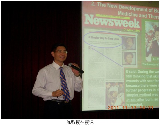 經(jīng)過北京片區(qū)彭韶君、郭君、何蓮聯(lián)絡(luò),由陳永翀教授授課,在2011年11月17號由醫(yī)務(wù)科組織了全院多科室美寶再生技術(shù)培訓(xùn),醫(yī)院多功能廳坐滿了聽課醫(yī)生,來自外科、皮膚科、骨科、婦產(chǎn)科、急診科等科室。