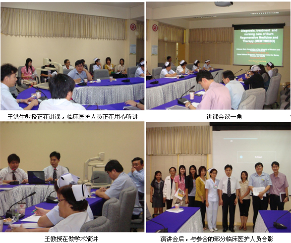 泰國2011年醫(yī)療開發(fā)活動繼續(xù)進(jìn)行。2011年3月7日,受Kampangpet Provincial Hospital, (Kampangpet, Thailand)醫(yī)院外科邀請,北京美寶燒傷創(chuàng)瘍研究所副所長、中國燒傷創(chuàng)瘍科技中心臨床研究部王洪生主任于13點(diǎn)30抵達(dá)該醫(yī)院會議室做學(xué)術(shù)交流。 學(xué)術(shù)交流活動從下午2點(diǎn)正式開始至4點(diǎn)半結(jié)束,共計27名醫(yī)護(hù)人員參與,醫(yī)生5名,護(hù)士22名。 其中重點(diǎn)醫(yī)生3名。主要介紹了皮膚原位再生醫(yī)療技術(shù)在燒傷,創(chuàng)傷,潰瘍方面的應(yīng)用及病例介紹。醫(yī)護(hù)人員聽課很認(rèn)真,提問踴躍。問題主要集中在: 1. MEBO 能否用在感染傷口上;2. 燒傷傷口護(hù)理的要點(diǎn);3.耕耘刀是什么樣子,能否給我們看看;4. MEBO與磺胺嘧啶銀的對照研究。王主任均給予了詳細(xì)的解答。收到了與會醫(yī)護(hù)人員的熱烈掌聲和一致好評。 晚上7點(diǎn), 王洪生主任又與這三名重點(diǎn)醫(yī)生進(jìn)行圓桌交流。 主要話題涉及到:1. 中國燒傷病人的致病原因;2. MEBO在增生性瘢痕和瘢痕疙瘩的治療; 3. 微粒皮種植的具體步驟。對于王洪生主任扎實的再生醫(yī)學(xué)理論基礎(chǔ)和豐富的臨床經(jīng)驗,與會人員均給予了高度的評價,而且對這項醫(yī)療技術(shù)表達(dá)了強(qiáng)烈的熱情。 其中有一名醫(yī)生在臨床上已經(jīng)使用皮膚原位再生醫(yī)療技術(shù)長達(dá)兩年,治愈了最嚴(yán)重?zé)齻牟∪说腡BSA達(dá)到20%。他對皮膚原位再生醫(yī)療技術(shù)治愈燒傷患者所大刀隊的臨床效果信心滿滿。他現(xiàn)正在嘗試用該方法治療更嚴(yán)重的燒傷患者及各類慢性潰瘍的患者。同時,他對微粒皮種植技術(shù)表達(dá)了強(qiáng)烈的興趣,希望能夠進(jìn)一步學(xué)習(xí)該技術(shù)。