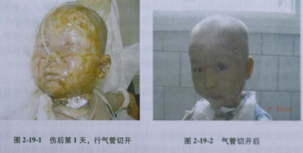 患兒系重度吸入性損傷,圖2191燒傷后第1天,持續(xù)低流量吸氧后,血氧飽和度波動(dòng)在70%~90%,明顯痰鳴,雙肺散在濕啰音,三凹征,行氣管切開;圖2192切開后,出現(xiàn)氣管軟骨軟化,塌陷,所以,需長(zhǎng)期帶氣管套管生活。