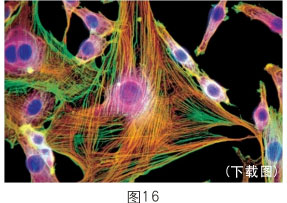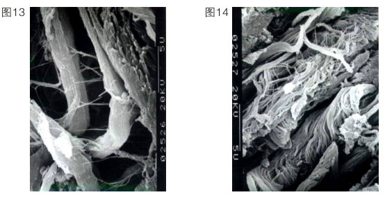 上述內(nèi)容說明再生復原重要的是要恢復其皮膚正常的生理功能。正常人的皮膚衰老了,意味著他皮膚的很多功能缺失了或退化了。因此我們的皮膚再生必須控制細胞,讓細胞強壯,恢復正常生理功能。我們在實踐中就啟動了角蛋白十九型干細胞,當然也可以啟動角蛋白十九型以下的細胞。我們首先把表皮基底層細胞啟動起來,使它可以增加生命活力,重建,同時成纖維細胞也更新。一個90歲的老人,基底細胞只有5%是有功能的。人一旦衰老了,細胞就難以再生到足夠的數(shù)量,所以一定要保證再生物質(zhì)的量,確保細胞的功能。一般來說,成纖維細胞的功能,隨著年齡的增長會代謝低下,這個低下指的是產(chǎn)生纖維的速度減慢、產(chǎn)生的量減少,產(chǎn)生的膠原纖維不成束。一個正常細胞產(chǎn)生的纖維如左圖所示(圖13),一個衰老的細胞產(chǎn)生的纖維如右圖所示。(圖14)這個衰老的細胞產(chǎn)生的絲是雜亂無章的,沒有彈力,又散又少。人老了,在細胞里產(chǎn)生的原纖維