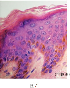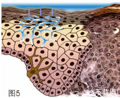 世界上化妝品無論配方如何,這些外源性化妝品都很難進入到真皮。之所以這么說,是因為在基底細胞層下面有一個膜(圖7),這個膜不僅是為了表皮與真皮的連接,這也是解決皮膚器官再生復原的一個最重要的技術(shù)環(huán)節(jié)。這個基底膜具有半通透性,在皮膚和斷指再生治療技術(shù)上,我們仿生了這個膜,這層膜的下面有血管、神經(jīng),但血管過不了這層膜。如果你的皮膚一旦出血,就說明是這層膜破了。我們看到的血絲,都是在基底膜之下的,除非異常的血絲,有些病變的可以突出到基底膜之上。正常的生理情況下,血管都在基底膜下,膠原纖維也在基底膜下,纖維無法通過,唯一能通過的是神經(jīng)末梢。(圖8)神經(jīng)延伸到基底膜,基底膜外面還有一層膜包繞在神經(jīng)外面,一但穿過了這個膜就成了沒有膜包繞的纖維,叫神經(jīng)纖維的暴露端,所以膜上面除去表皮的四大層,還有一些無包膜的神經(jīng)末梢纖維。因此觸摸的時候會出現(xiàn)感覺。