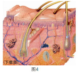 對于以上這些結(jié)論我們非常有把握,因為我們有20多年的皮膚再生臨床經(jīng)驗。美寶濕潤燒傷膏并不是一下子就研究出來的,從開始的創(chuàng)面濕潤到一般的創(chuàng)面愈合,接著到深二度減少疤痕愈合,再到深二度愈合無疤痕,而后又發(fā)展到三度燒傷能愈合有疤痕,再到三度燒傷愈合無疤痕,以后又進展到不僅僅是皮膚燒傷,而且傷及到肌肉骨骼,都能夠?qū)崿F(xiàn)皮膚再生,只要有骨頭在,就能使軟組織和皮膚再生出來 ,這么一步一步走過來的。所以,從皮膚的表面開始,一步一步到最后實現(xiàn),用一個細胞復制再生出所有的細胞。在這個過程當中我們已經(jīng)把整個皮膚器官再生出來了,并形成了皮膚缺損如何再生的理論和技術(shù)。然后再思考正常的皮膚如何再生,正常皮膚的毛細血管有一些帶有半抗原性,或帶有特異排斥性質(zhì),一些物質(zhì)到毛細血管就被阻止了,無法進入,只能通過淋巴系統(tǒng)被轉(zhuǎn)回,因此沒有辦法通過毛細血管的吸收來營養(yǎng)細胞。皮膚和別的器官不一樣,有些帶類似抗原性質(zhì)的成分到達不了細胞,所以要結(jié)合外源性注入的方法,雖然外源性物質(zhì)導入量不大,但是都能夠被導入真皮層。(圖3)汗腺、皮脂腺、毛囊、毛發(fā)等實際上從胚胎時期就是由一個干細胞發(fā)育來的。表皮的基底細胞排得很整齊,看上去都是一個個的,實際上它們是連續(xù)的,皮膚表皮的上半部分都是靠基底細胞分化而來的?;准毎厦娓鲗涌梢远紱]有,但這層基底細胞必須存在,只要有這層細胞,皮膚的表面就會恢復得完好無損。醫(yī)學上常說的皮膚的生理性再生就是指表皮基底細胞層再生的概念,只要這層細胞在,就能把表皮外面各層都再生出來。表皮的組成層次由深層到表層主要是基底層、棘層、顆粒層,最上面是角質(zhì)層。