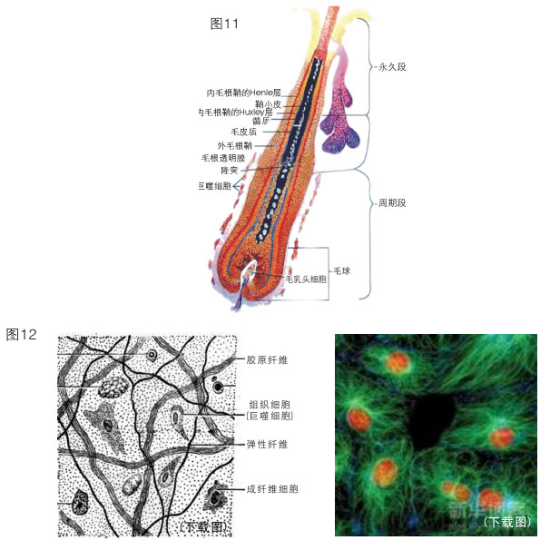 汗腺分泌細胞。毛囊細胞是從卵胚開始的一個新的細胞,是一個獨立的家族。人的身上有三種毛:短毛、長毛和毳毛,頭發(fā)為長毛。從胚胎時期開始,生長毛發(fā)的細胞就有三個不同原發(fā)細胞,一個是長長毛的,一個是長短毛的,一個是長毳毛的,毳毛即汗毛。它們發(fā)生的時間不同,短毛和長毛是來自于最原始的卵胚,而汗毛可來自于表皮干細胞,也就是角蛋白19型家族。所以大面積深度燒傷時愈合以后都能長汗毛,但長不了長毛也長不了短毛。在這里也告訴大家,對付脫發(fā)應該在人還沒有脫落頭發(fā)前加以控制,不讓頭發(fā)脫落,一旦毛乳頭全脫落了就長不出頭發(fā)來了,能長出的不過是類似于短毛的一些毳毛(圖11)。這是因為在再生時,毛發(fā)是利用毛發(fā)里邊儲存的信息機關(guān)——隱窩來再生的,毛隱窩里儲存有短毛和毛干的信息,任何皮膚里面都有這種信息。由于人的進化造成有些部位不長毛,有些長毛,這個毛隱窩是由于人的進化所形成的,但種族不同,毛隱窩則有所不同,就像美國人身上有很多毛,但那也是短毛而不是長毛。咱們亞洲人皮膚比較平滑,棕色人、黑人也比較平滑,是因為隱窩比較弱,不長那么長的毛。我們曾研究過怎么能讓光禿頭頂長出細毛,當初我們把每個細胞都拿出來,看是哪一種細胞長的,發(fā)現(xiàn)都是毛隱窩長的。雖然一旦失去了毛囊就不能再長頭發(fā)了,但是只要毛隱窩還在,就還有長毛的功能,每一個隱窩都能長出一個毳毛來。社會上某些生發(fā)產(chǎn)品就是刺激這個隱窩的細胞,但這種刺激所長出的毛很脆弱,一碰就掉了,一旦沒有刺激作用了,這毛發(fā)就不長了。我們在燒傷治療中也發(fā)現(xiàn),只要有皮膚產(chǎn)生就有毳毛,當然手掌除外,手掌是沒有毳毛的,這是遺傳的特性。有人問男性的胡須是什么毛?這個毛有短毛的種類,也有長毛的種類,主要是長毛種類。