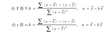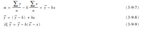 式中y為估計(jì)值;α為常數(shù),也稱為截距,即當(dāng)x等于零時(shí)在回歸直線軸上的交點(diǎn);b為回歸系數(shù),它是回歸直線的斜率,其意義是每當(dāng)x變動(dòng)一個(gè)單位,則y隨之變動(dòng)b個(gè)單位。