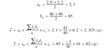 示例392樣本數(shù)n=40,組距ix=02,組距iy=10,(∑fxdx)=43,∑fxd2x=139,∑fYdY=-3,∑fyd2y=79,∑fdXdY=39。