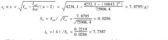 查t界值表(附表4):n′=8(10-2)時(shí),t(8)001=3355。本例t=77587,p<001, 回歸系數(shù)有非常顯著意義。
