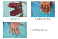 患者周某,男,32歲,因車床機扎傷左手中指和無名指末節(jié)離斷就治于廣東省中山市黃圃人民醫(yī)院,經清創(chuàng)和使用MEBO,全程按燒傷皮膚再生醫(yī)療技術要求換藥,41天治愈。受傷手指再生恢復外觀和功能,無功能障礙。