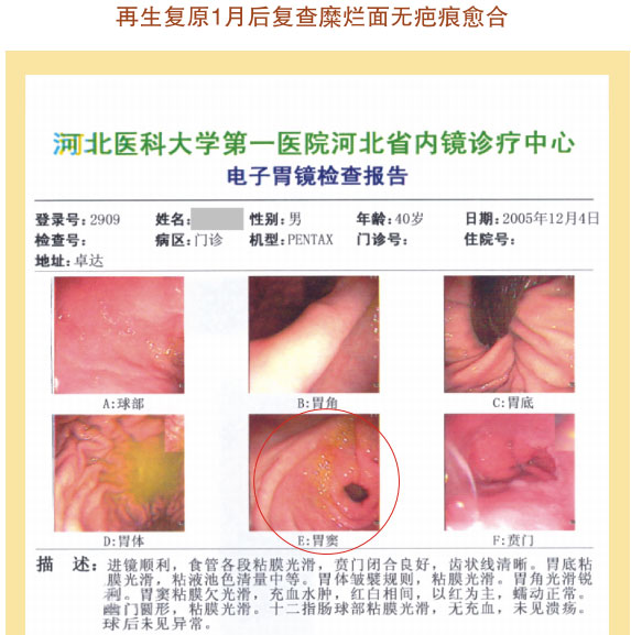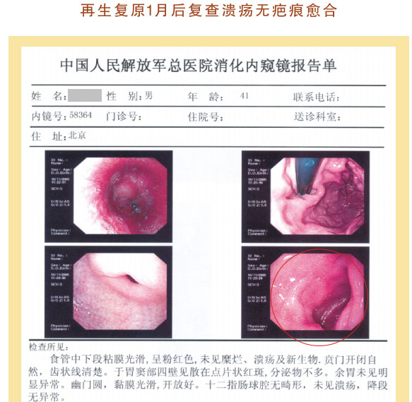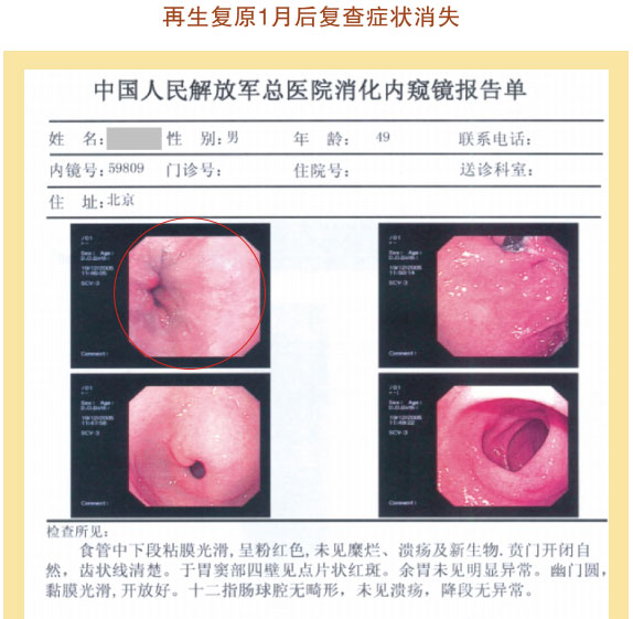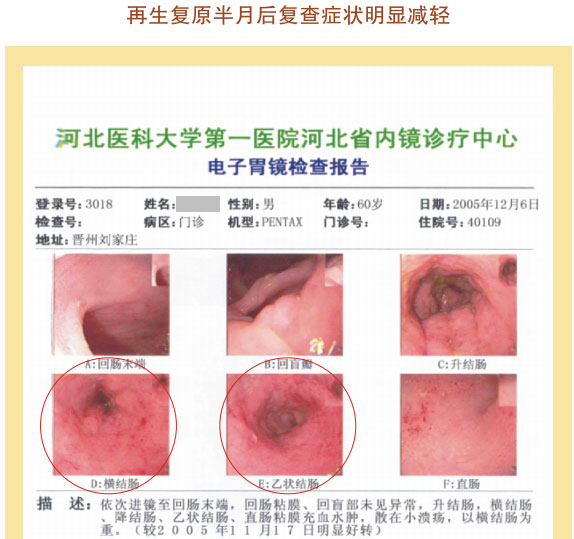 例1:張某某,男,56歲, 2007年5月開始胃腸再生復原,半年后整個胃腸系統(tǒng)大部分再生復原,粘膜體征均表現(xiàn)為年輕狀態(tài)。