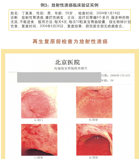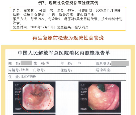 例2:蓋某某,女,54歲,2007年6月開始胃腸器官原位再生復原,一年后整個胃腸系統(tǒng)大部分再生復原,粘膜體征均表現(xiàn)為年輕狀態(tài)。