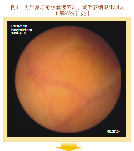 再生復原前膠囊鏡表現(xiàn):小腸粘膜和粘膜下層明顯萎縮退化,變薄,粘膜下血管網(wǎng)及血管畔清晰可見,小腸絨毛稀疏、長度變短、退化明顯,部分區(qū)域絨毛完全脫失,隱窩變淺,整個絨毛面積變小。整個胃腸黏膜系統(tǒng)呈現(xiàn)衰老狀態(tài)。