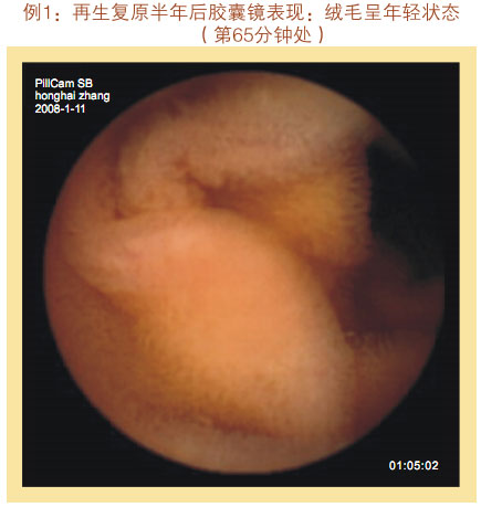 再生復原一年后膠囊鏡表現(xiàn):小腸粘膜和粘膜下層明顯增厚,看不到粘膜下血管網(wǎng)及血管畔,絨毛濃密、長度增加,直徑增粗,沒有明顯斷裂、脫落、脫失的絨毛粘膜,隱窩變深。整個胃腸黏膜系統(tǒng)呈現(xiàn)為年輕健康的狀態(tài)。
