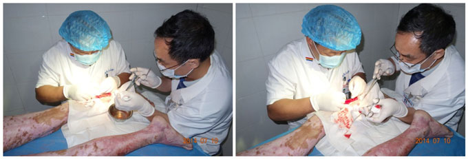 培訓結(jié)束后,趙瑞慶教授針對運動醫(yī)學科等科室醫(yī)務(wù)人員提出的臨床問題,分別作了新鮮傷口正確使用創(chuàng)瘍貼、早期防治疤痕的耐心解答。趙瑞慶還在燒傷整形科,為鐵水燒傷的病人李某某做了殘余肉芽創(chuàng)面皮簇種植術(shù)的示范操作演示。煙臺山醫(yī)院本次培訓手術(shù)演示,對該院開展多科室使用燒傷創(chuàng)瘍再生醫(yī)學與療法起到了很好的推動作用。