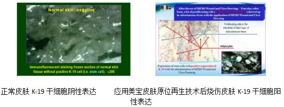 3月14日上午11點,在會議的最后一天,大會組委會特別安排了一場干細胞為主題的演講。同樣是來自中國燒傷創(chuàng)瘍科技中心臨床部主任、北京榮祥再生醫(yī)學研究所副所長、北京中西醫(yī)結(jié)合學會燒傷專業(yè)委員會副主任委員、中國燒傷創(chuàng)瘍雜志社副社長的陳永翀教授以‘K-19干細胞臨床應用研究原位再生三度燒傷皮膚’(The Clinical Application Research of K-19 Stem Cells to Regenerate Full-thickness Burnt Skin in situ)為題介紹了,皮膚原位再生的原理是通過再生物質(zhì)使?jié)撃芨杉毎D(zhuǎn)變成干細胞原位再生皮膚組織器官,并且通過免疫熒光法標記出K-19型干細胞表達信息。