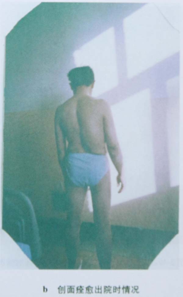 [病例3]患者賈××,36歲,石家莊市尼龍廠工人,住院日期200494日,出院日期20041130日,患者于工作中不慎從五米高處摔下,跌入電石爐中,造成全身堿燒傷,急入石家莊井陘礦務(wù)局醫(yī)院就診。入院診斷工業(yè)堿水全身Ⅱ—Ⅲ度燒傷總面積達(dá)92%TBSA(淺Ⅱ度40%,深Ⅱ度27%,Ⅲ度淺型10%,Ⅲ度深型15%)。即刻采用美寶濕潤(rùn)燒傷膏外涂保護(hù)創(chuàng)面,同時(shí)采取全身系統(tǒng)治療。包括強(qiáng)心、抗休克、抗感染、保肝、保腎、保護(hù)胃腸黏膜、持保水、電解質(zhì)平衡和酸堿平衡、營(yíng)養(yǎng)支持等綜合搶救措施,創(chuàng)面全程規(guī)范應(yīng)用燒傷皮膚原位再生技術(shù)和專用藥品美寶濕潤(rùn)燒傷膏?;颊哂谌朐汉?/span>24小時(shí),發(fā)生全身侵襲性感染,血常規(guī)WBC13×109/L下降到5×109/LPLT147×109/L下降到8×109/L;肝功 谷丙轉(zhuǎn)氨酶高達(dá)362U/L,精神差,腹脹明顯,體溫395℃,呼吸淺快,36/分。心率快,134/分??诖阶辖C,創(chuàng)面灰暗,并見片狀出血點(diǎn),考慮為膿毒癥及并發(fā)肝、心等臟器功能不全。當(dāng)即給予高效、足量抗生素控制感染,加強(qiáng)心腦肝腎等臟器的支持保護(hù),對(duì)創(chuàng)面進(jìn)行徹底清理?yè)Q藥。