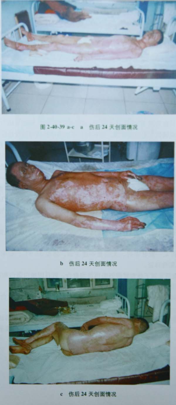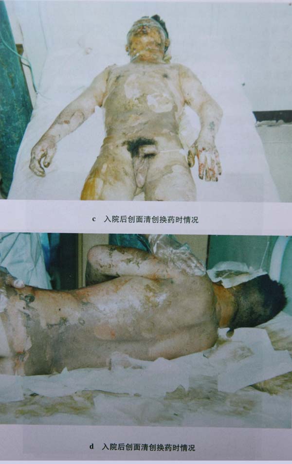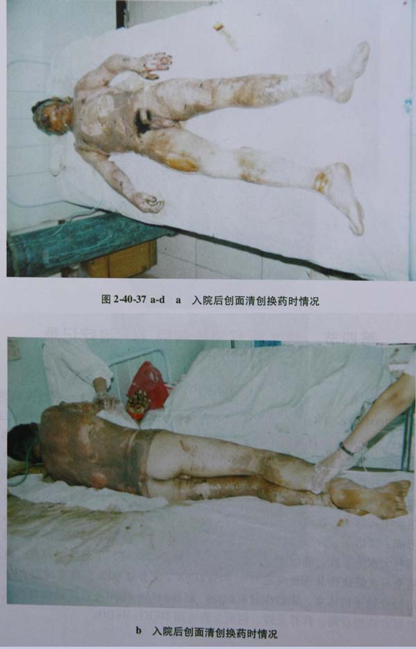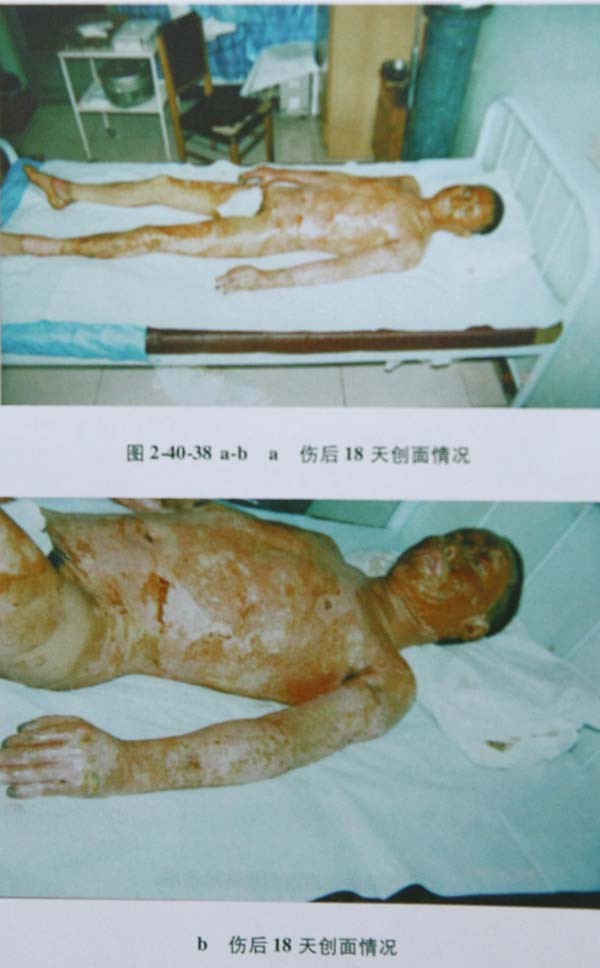 [病例4]患者李××,男,31歲,漢族,工人。以“面部、軀干、四肢火焰燒傷伴疼痛1小時(shí)”為主訴于2004年6月11日入院。入院查體體溫37℃,心率84次/分,呼吸22次/分,血壓110/96mmHg;發(fā)育正常,營養(yǎng)良好,神清語明,扶入病房,查體合作,全身皮膚撕脫,頭發(fā)燒焦,面部皮膚撕脫,基底蒼白,雙側(cè)瞳孔等大同圓,對光反射靈敏,頸軟,氣管居中,甲狀腺未觸及腫大,頸部皮膚撕脫,基底潮紅,胸廓對稱無畸形,皮膚部分撕脫,呼吸運(yùn)動(dòng)對稱,心律整,各瓣膜區(qū)未聞及雜音,腹平坦、軟、無肌緊張,肝脾肋下未觸及,腸鳴音正常,外陰及肛門未見異常,脊柱正常生理彎曲,腹部皮膚部分撕脫,基底蒼白,皮溫低,雙上肢皮膚撕脫,基底蒼白,創(chuàng)面有水皰形成,滲出多,腫脹明顯,皮膚如皮革樣改變,疼痛感覺減弱至消失,雙下肢皮膚部分撕脫,創(chuàng)面有大水皰形成,滲出多,腫脹明顯,疼痛感覺尚可;生理反射存在,病理反射未引出。入院診斷全身火焰燒傷Ⅱ—Ⅲ度總面積90%TBSA(深Ⅱ度60%,Ⅲ度淺型20%,Ⅲ度深型10%)入院后治療給予抗休克、強(qiáng)心保腎、抗炎、對癥治療、應(yīng)用高效廣譜低毒的抗生素、抗感染、預(yù)防多臟器官功能衰竭、營養(yǎng)支持、創(chuàng)面全程應(yīng)用MEBT/MEBO。