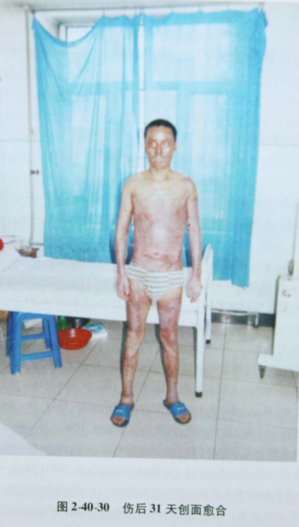 傷后第30天,患者經(jīng)抗休克,抗感染,預(yù)防應(yīng)激性消化道潰瘍,創(chuàng)面清潔后行濕潤暴露療法等綜合治療,現(xiàn)病人一般狀態(tài)好,生命體征平穩(wěn),創(chuàng)面生理性愈合,無疤痕形成及功能障礙,今日辦理出院。