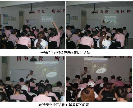 趙瑞慶教授在2個(gè)小時(shí)的培訓(xùn)中介紹了北京燒傷創(chuàng)瘍研究所20年的發(fā)展歷程,以圖文并茂的形式重點(diǎn)講解了美寶疤痕軟膏的藥理作用。臨床適應(yīng)癥,用通俗易懂的方式講解如何區(qū)分新鮮瘢痕與陳舊性瘢痕,如何掌握治療兩者瘢痕的技術(shù)要點(diǎn),如何規(guī)范應(yīng)用疤痕軟膏的奧秘。