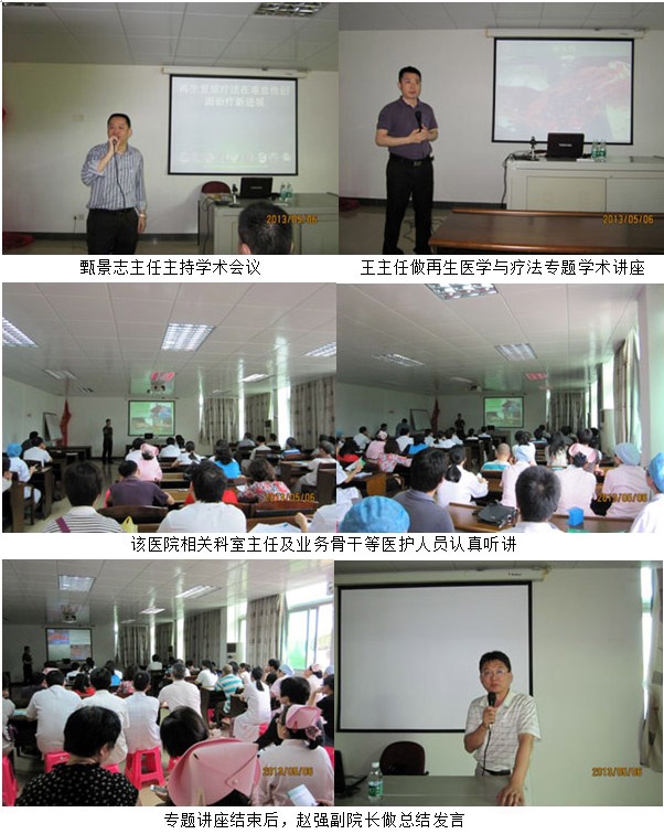 2013年12月6日下午,中國燒傷創(chuàng)瘍雜志副總編輯、中國中西醫(yī)結(jié)合學(xué)會燒傷專業(yè)委員會常委兼秘書、北京燒傷創(chuàng)瘍研究所副所長、臨床研究部主任王洪生研究員應(yīng)邀來到臺山市中醫(yī)院作專題為“再生復(fù)原療法在燒傷在難愈性創(chuàng)瘍創(chuàng)面治療新進展”的學(xué)術(shù)報告之后,皮膚再生醫(yī)療技術(shù)在該醫(yī)院創(chuàng)瘍血管外科開始規(guī)范應(yīng)用及慢性難愈性創(chuàng)面臨床驗證研究。