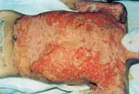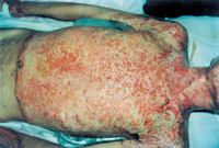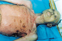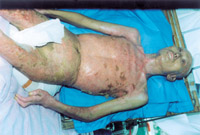 入院后即快速補(bǔ)液糾正休克,行氣管切開,改善通氣功能,左前臂、雙小腿Ⅲ度環(huán)形焦痂切開減張,改善肢端血運(yùn)。上腔靜脈穿刺置右心漂浮導(dǎo)管行心功能各項指標(biāo)監(jiān)測。于傷后第二天行四肢切痂微粒植皮,傷后第六天行胸腹部切痂植大張開洞異體表,傷后10天(術(shù)后4天)胸腹部嵌植小片自體皮?;颊邆?8天出現(xiàn)嚴(yán)重綠膿桿菌敗血癥,持續(xù)低溫昏迷一周,經(jīng)全力搶救,敗血癥得以控制;又先后9次行植皮手術(shù),大部創(chuàng)面封閉;曾于傷后43天出現(xiàn)左眼角膜潰瘍,以點(diǎn)眼、球后結(jié)膜下注射等治療,潰瘍愈合。住院期間為預(yù)防應(yīng)激潰瘍,控制感染,防止肺部并發(fā)癥等,亦采取了相應(yīng)的措施。共住院70天。