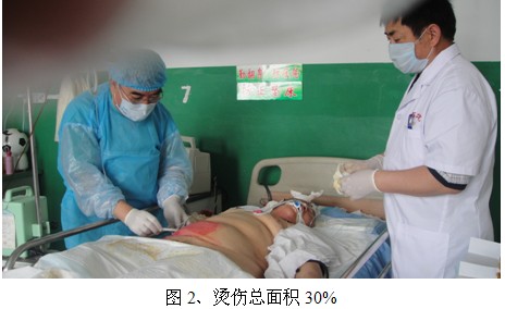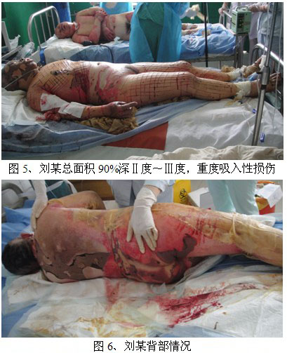 北京燒傷創(chuàng)瘍研究所醫(yī)療部主任王廣順教授于2011年4月30日下午19:15分,應(yīng)該院楊院長(zhǎng)、張西軍主任、馬思泉主任的邀請(qǐng),在山東省辦事處劉玉芳同志陪同下來到該院重癥監(jiān)護(hù)室查看了3名燒傷患者,他們都是傷后時(shí)間約20個(gè)小時(shí)左右,分別是太陽能熱水器故障燙傷總面積30%、腦外傷、頭皮裂傷;鍋爐爆炸燒傷張某燒傷總面積達(dá)85%TBSA,為深Ⅱ度~Ⅲ度燒傷,重度吸入性損傷;劉某燒傷總面積90%TBSA,為深Ⅱ度~Ⅲ度燒傷,重度吸入性損傷。前者處在嗜睡狀態(tài),后二者血小板僅54×109/L,張某尿色深混濁,7個(gè)小時(shí)內(nèi)尿量?jī)H300ml,躁動(dòng)不安,創(chuàng)面腫脹、硬無彈性。王教授立即對(duì)Ⅲ度創(chuàng)面進(jìn)行“切劃減張療法”,并涂美寶濕潤(rùn)燒傷膏及用美寶創(chuàng)瘍貼止血治療。平衡鹽液糾正水電介質(zhì)酸堿紊亂、20%甘露醇125ml-速尿20mg-利多卡因50mg-654-25mg組成的利尿合劑、血必凈、生脈注射液、補(bǔ)充血小板等全身治療方案,目前患者血小板已回升、尿量增加,病情逐漸穩(wěn)定。