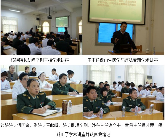 學(xué)術(shù)講座于當(dāng)日下午3時30分在該醫(yī)院會議室舉行,學(xué)術(shù)活動由該醫(yī)院院長助理辛剛主持,在專題學(xué)術(shù)講座中,王主任向?qū)W員們介紹了再生復(fù)原療法的概念、闡述了皮膚原位再生醫(yī)療技術(shù)原理、與傳統(tǒng)醫(yī)學(xué)療法相比再生醫(yī)療技術(shù)的優(yōu)越性,以及近期在英國外科雜志及國際燒傷雜志發(fā)表的有關(guān)“磺胺嘧啶銀及含銀敷料用于創(chuàng)傷(含燒傷)創(chuàng)面,造成創(chuàng)面愈合延遲、增加疼痛和感染率”等最新觀點;并著重講解了濕潤暴露療法、半暴露療法和包扎療法的操作方法及要點;通過臨床病例圖片側(cè)重分析褥瘡、典型糖尿病足、下肢潰瘍等外科常見創(chuàng)傷治療前后過程。重點講述了再生療法在糖尿病足等難愈性創(chuàng)傷治療新進(jìn)展的情況。通過視頻講述了規(guī)范的換藥方法。治療后理想的愈合效果讓學(xué)員們對再生醫(yī)療技術(shù)有了更深刻的認(rèn)識,得到了在場領(lǐng)導(dǎo)及學(xué)員的認(rèn)可。